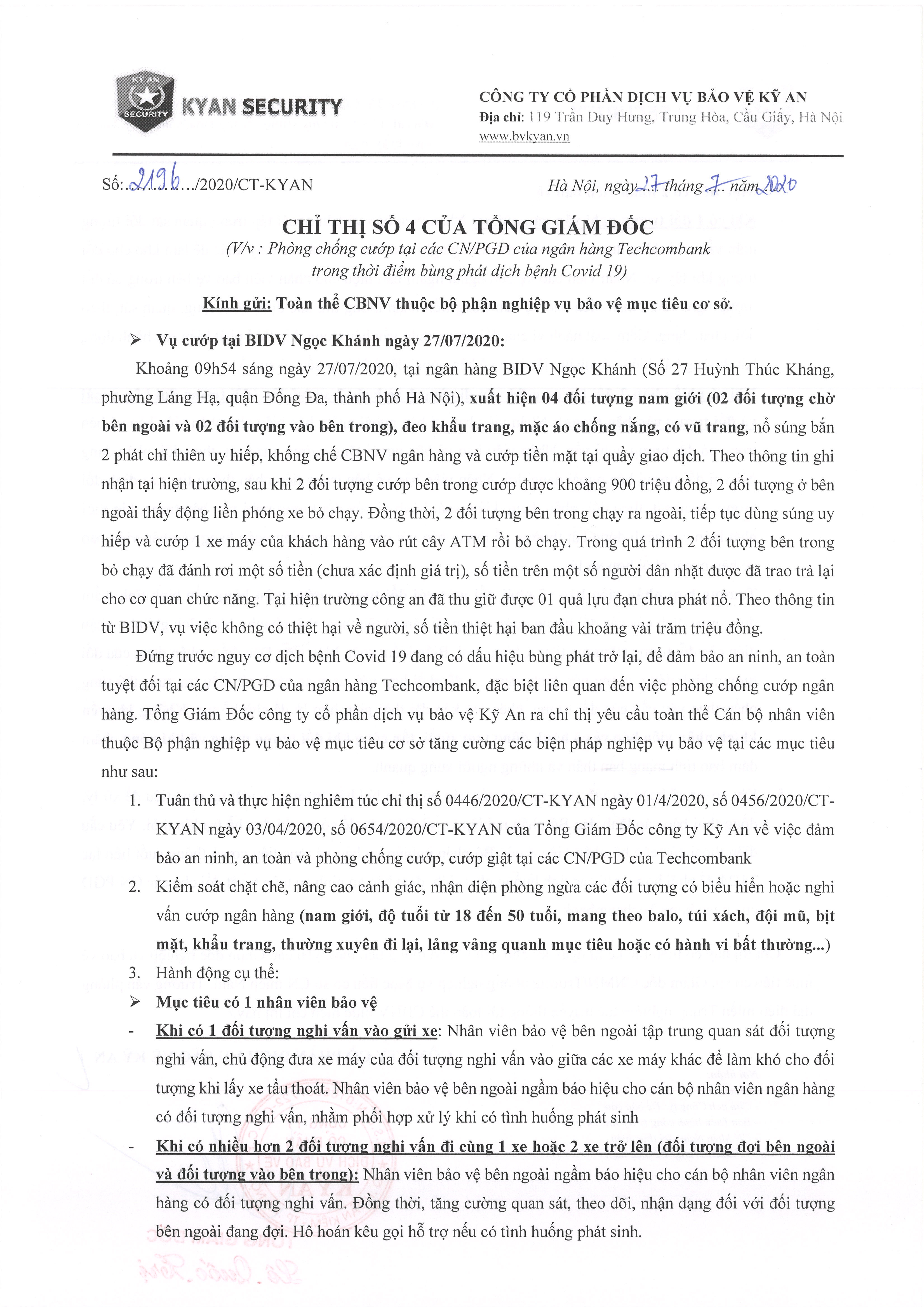 Đứng trước nguy cơ dịch bệnh Covid 19 đang có dấu hiệu bùng phát trở lại, để đảm bảo an ninh, an toàn tuyệt đối tại các CN/PGD của ngân hàng Techcombank, đặc biệt liên quan đến việc phòng chống cướp ngân hàng. Tổng Giám Đốc công ty cổ phần dịch vụ bảo vệ Kỹ An ra chỉ thị số 4 yêu cầu toàn thể Cán bộ nhân viên thuộc Bộ phận nghiệp vụ bảo vệ mục tiêu cơ sở tăng cường các biện pháp nghiệp vụ bảo vệ tại các mục tiêu CN/PGD: